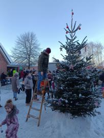 So konnte am 02. Dezember bei traumhaftem Winterwetter ein kleiner Weihnachtsmarkt vor dem Dörpshus stattfinden. Der Weihnachtsbaum wurde mit Selbstgebasteltem der Kindergartenkinder geschmückt. Das Team des Dörphuses hielt ein reichhaltiges Angebot an Getränken bereit, an denen sich alle wärmen konnten. Der Hunger konnte am Grill bei den Männern der Feuerwehr oder am Imbisswagen des Reitvereins mit selbstgebackenen Waffeln freiwilliger Muttis gestillt werden. Die Dörpsstimmen boten den musikalischen Rahmen und luden zum Mitsingen ein. Während die Eltern einen passenden Weihnachtsbaum vom Tannenhof Eggert aussuchen konnten, kam endlich der Besuch aus dem hohen Norden und stellte einen Sack mit kleinen Präsenten für die Kinder ab. Klein und Groß konnten nun Gedichte aufsagen, um dem Sack das Geheimnis zu entlocken. Während die Kinder auf dem Sportplatz im Schnee spielten oder mit dem Schlitten fuhren, nutzen Jung und Alt die Möglichkeit für einen kleinen Plausch.
